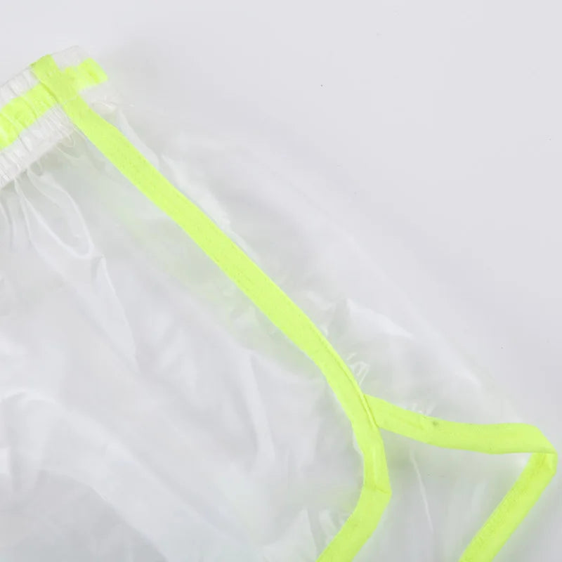 กางเกงขาสั้นแบบใสๆ กันน้ำ ทำจากโพลีเอสเตอร์คล้ายๆพลาสติกบางๆ แต่สัมผัวนิ่ม สีขาวใสมีความขุ่นเล็กน้อย ใส่แล้วอะไรที่อยากปิด มันจะปิดไม่ได้เลย